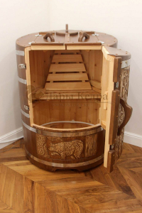 Это круглая фитобочка из кедра увеличенных размеров с толщиной стенок 45 мм. Подходит для людей высокого роста и крупной комплекции. Фитобочка оборудована откидными створками, дверцей и отверстием для головы. Верхний скос изделия делает положение головы более комфортным и улучшает обзор. Во время парения человек сидит внутри кедровой бочки, а голова находится снаружи. Благодаря этому исключается возможность перегрева. Подлокотники из кедра, встроенные ручки на створках и двери делают эксплуатацию более удобной.