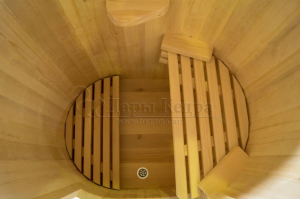 Готовый комплект - это полностью укомплектованный набор с фитобочкой для процедур парения. Овальная модель более просторна и удобна в использовании. Толщина стенок составляет 25 мм. Фитобочка оборудована откидными створками, дверцей и отверстием для головы. Во время парения человек сидит внутри кедровой бочки, а голова находится снаружи. Благодаря этому исключается возможность перегрева. Подлокотники из кедра, встроенные ручки на створках и двери делают эксплуатацию более удобной.